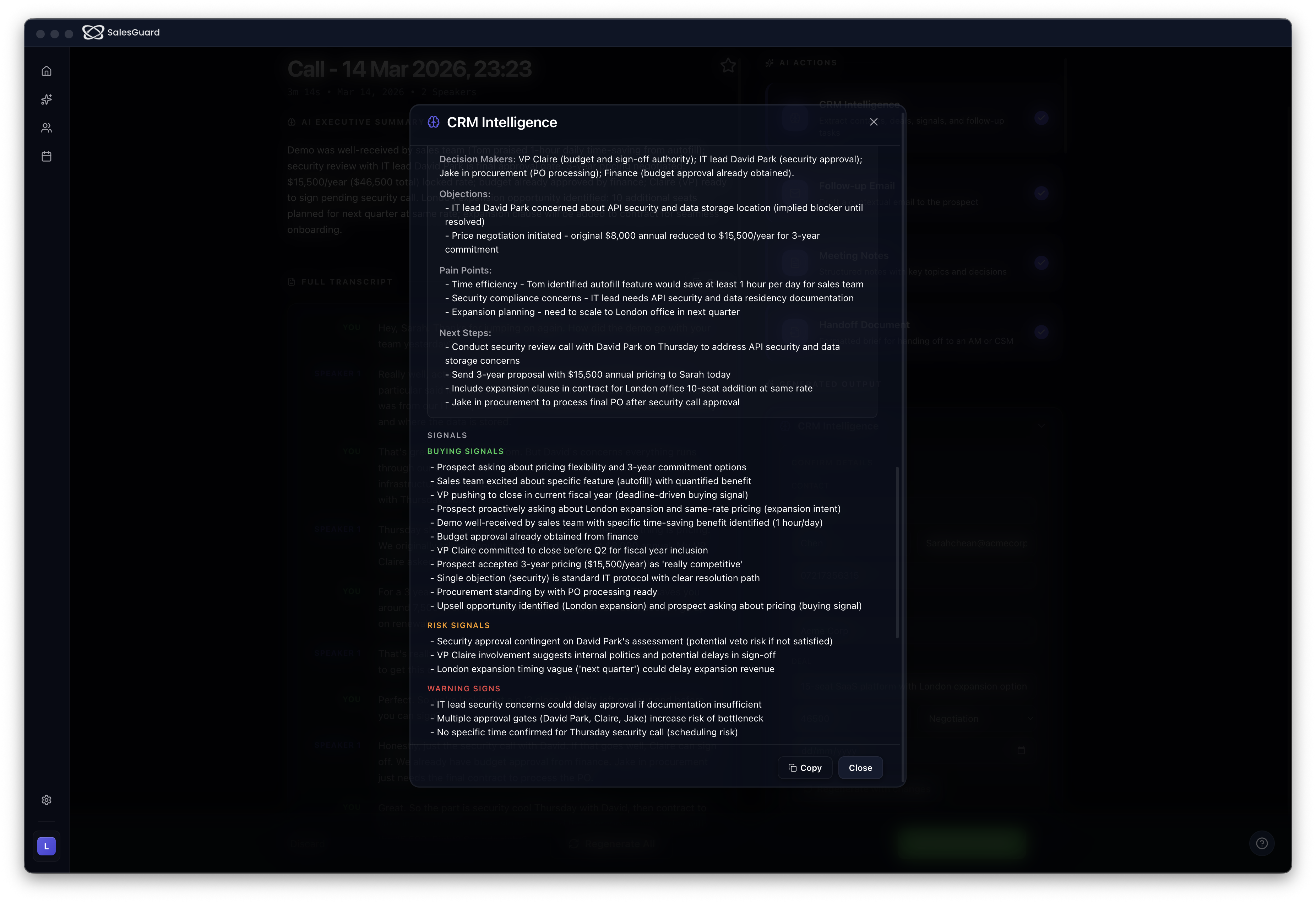 While you were focused on the call, SalesGuard was extracting 16 fields in the background. Contact info. Deal value. Objections. Next steps. Buying signals. Sentiment. All there before you close the laptop. Nothing to type.